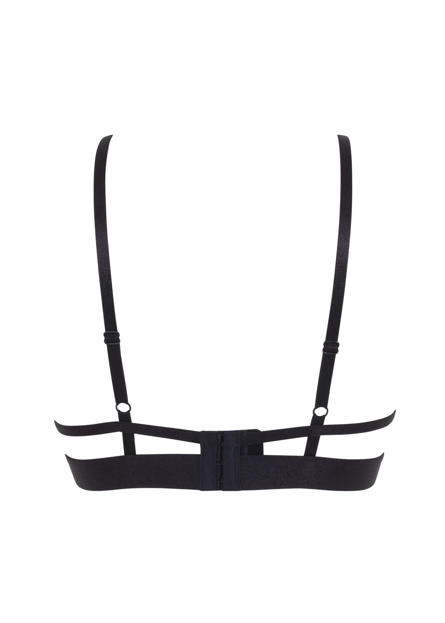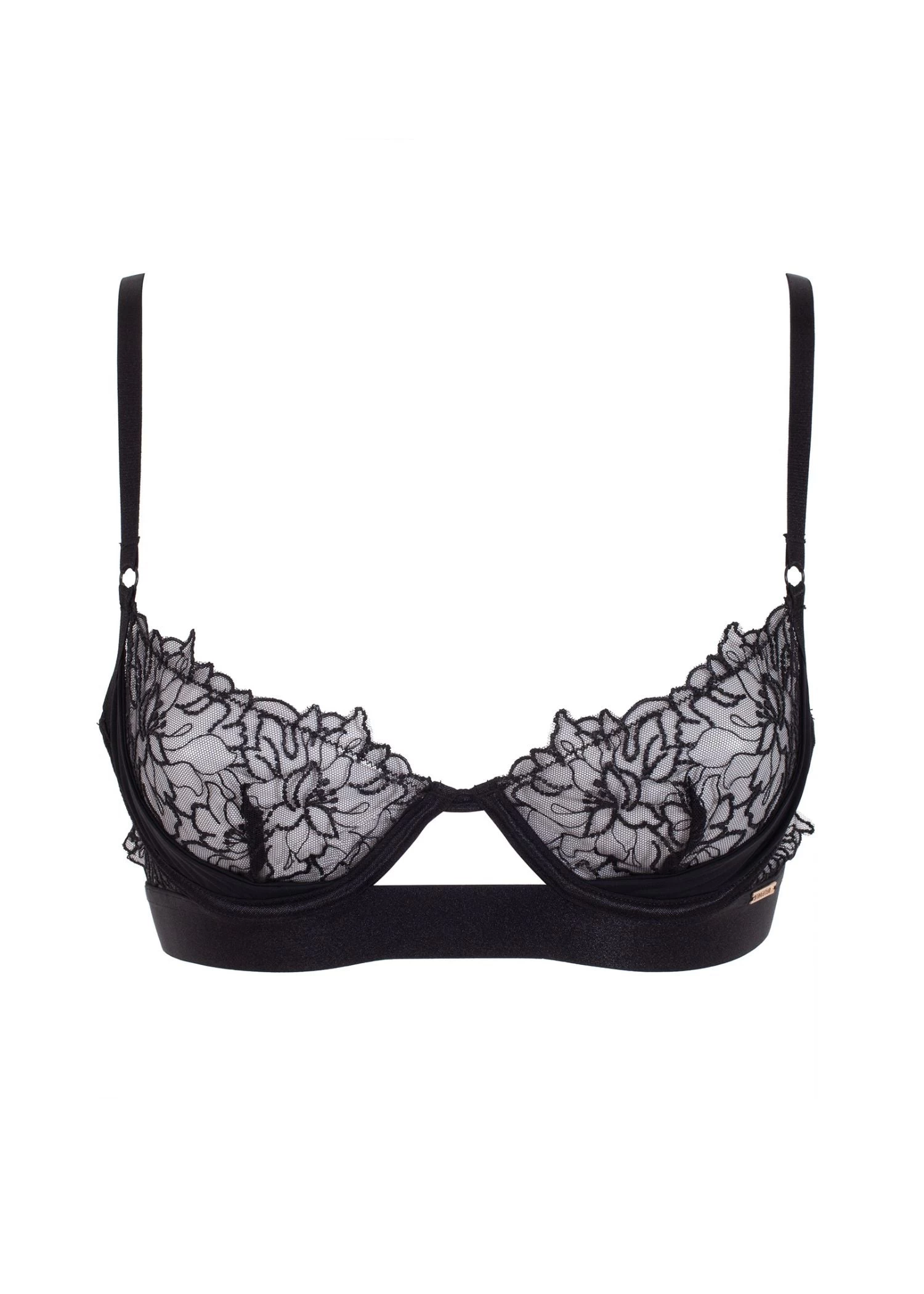 The Alanna bra by Bluebella is sophisticated and feminine with a modern edge. It features black floral embroidery with tonal hardware, and a wide underband that provides ultimate comfort at the waist while giving a sleek silhouette look.