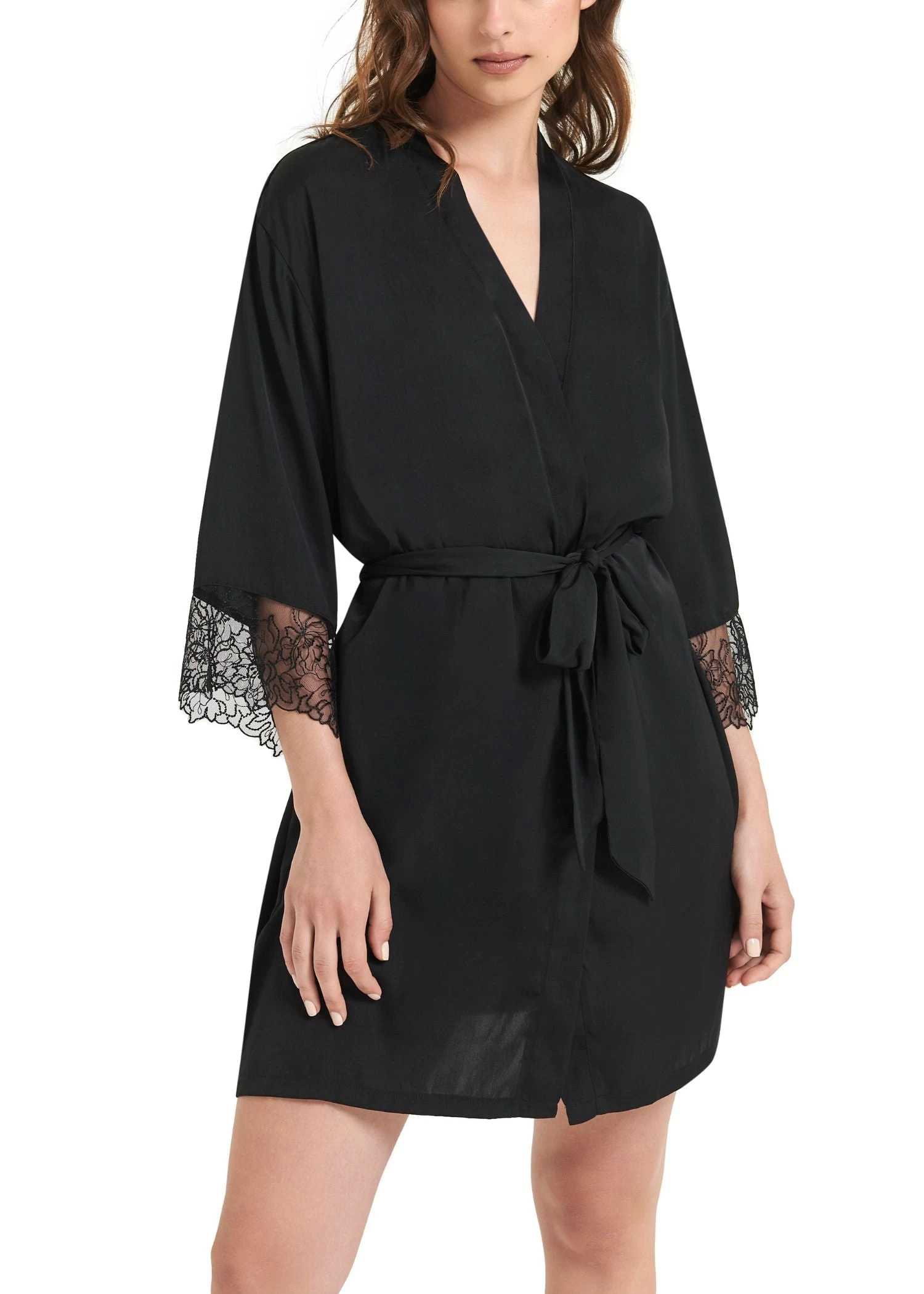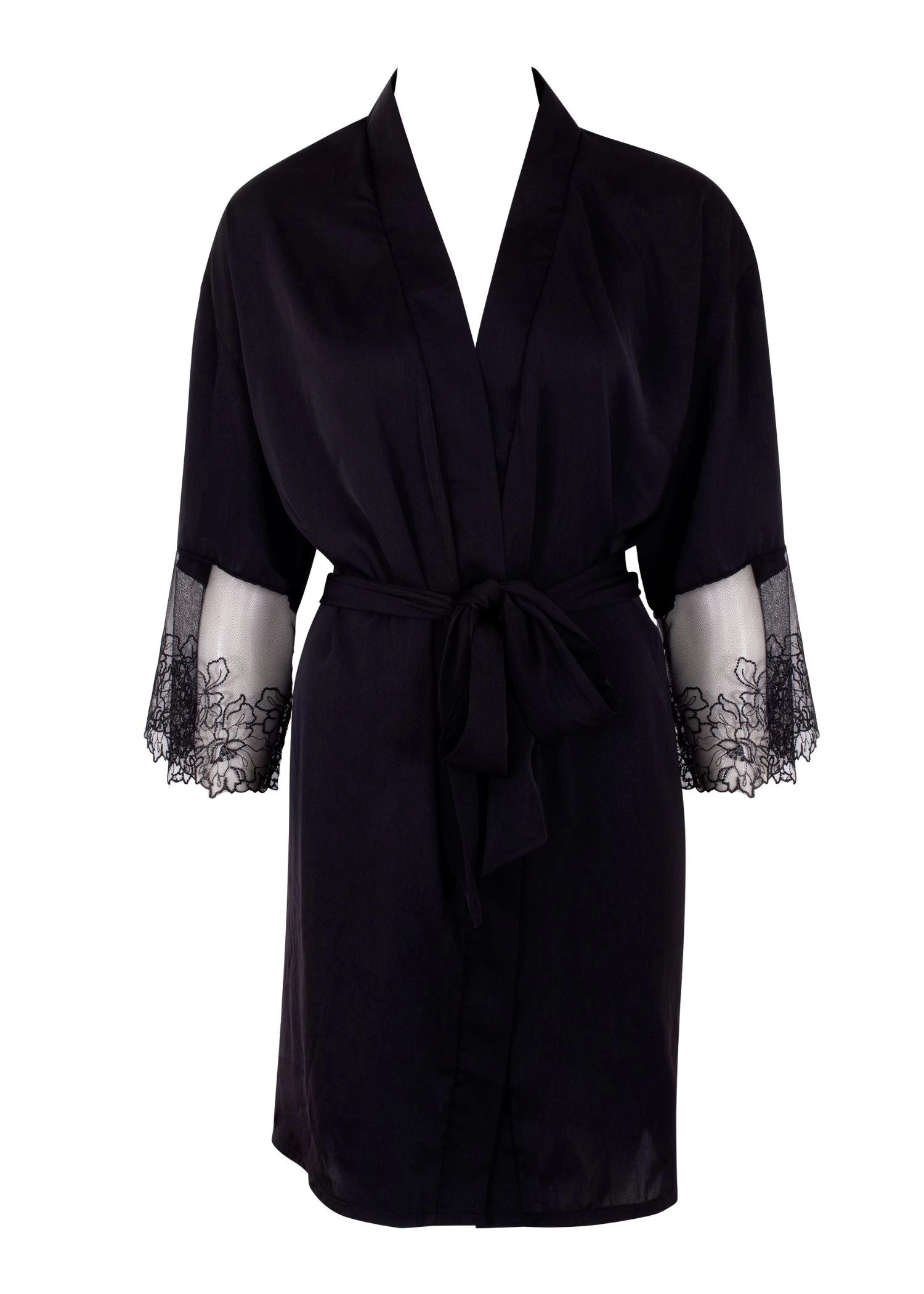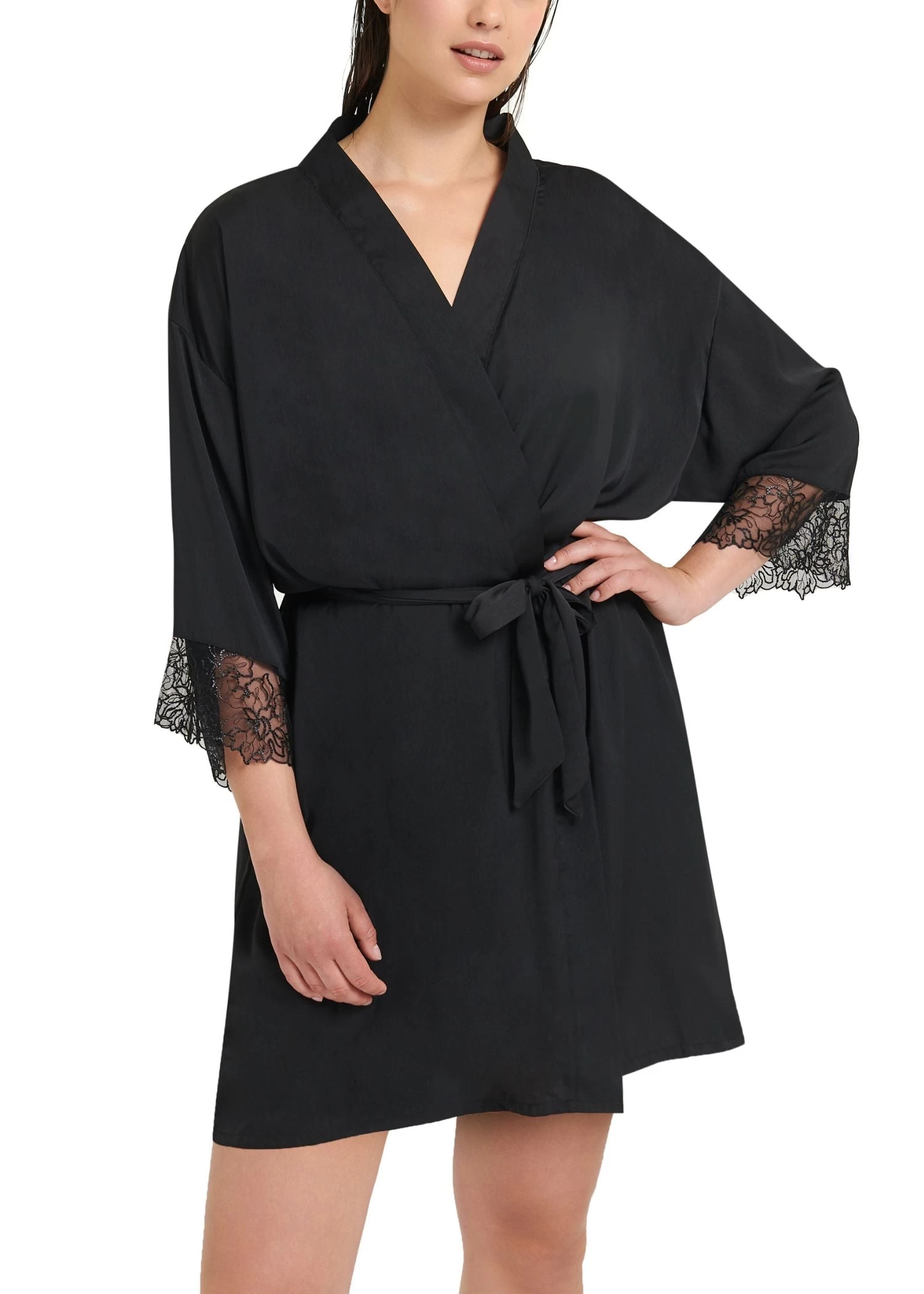 The perfect piece for wrapping around yourself after a long day, post-shower or as a finishing touch to your Alanna set, this gorgeous kimono is trimmed with intricate lace to the sleeves for a touch of elegant drama. The sleek, satin silhouette is complete with a matching tie belt that lets you modify the fit and decide just how much you’ll choose to conceal.