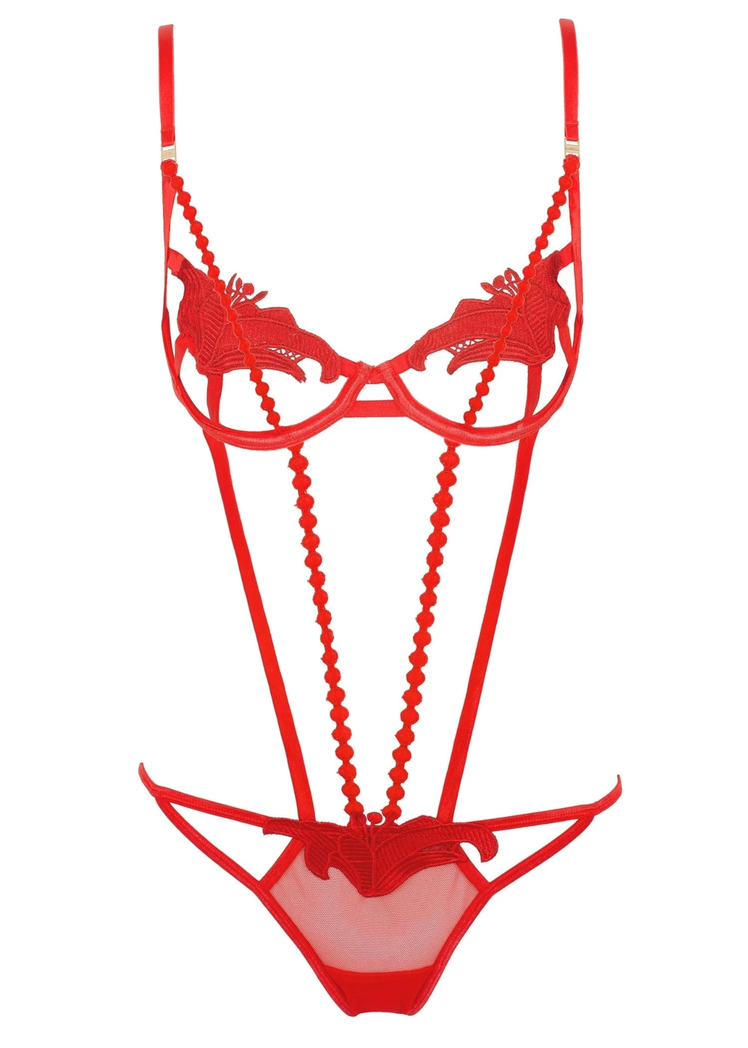 The Amina Wired Body is a stunning strappy bodysuit constructed using directional slimline banding with trim embellishments. A sculptural look topped with elegant embroidered lilies on open cups.