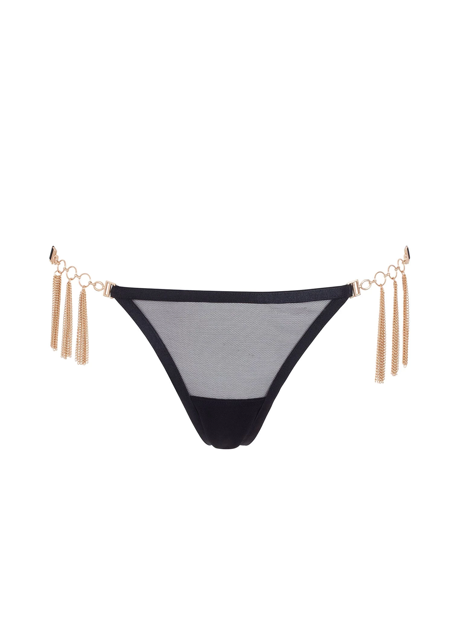 Fusing soft mesh with elegant, tasseled hardware, the Aurora thong is an opulent treat for the lovers of unapologetically daring lingerie. With a richly embellished front and a minimal back, this perfectly balanced piece brings provocation and glamour to your collection. Style it with the matching Aurora bra and flogger to bring your boldest fantasies to life.
