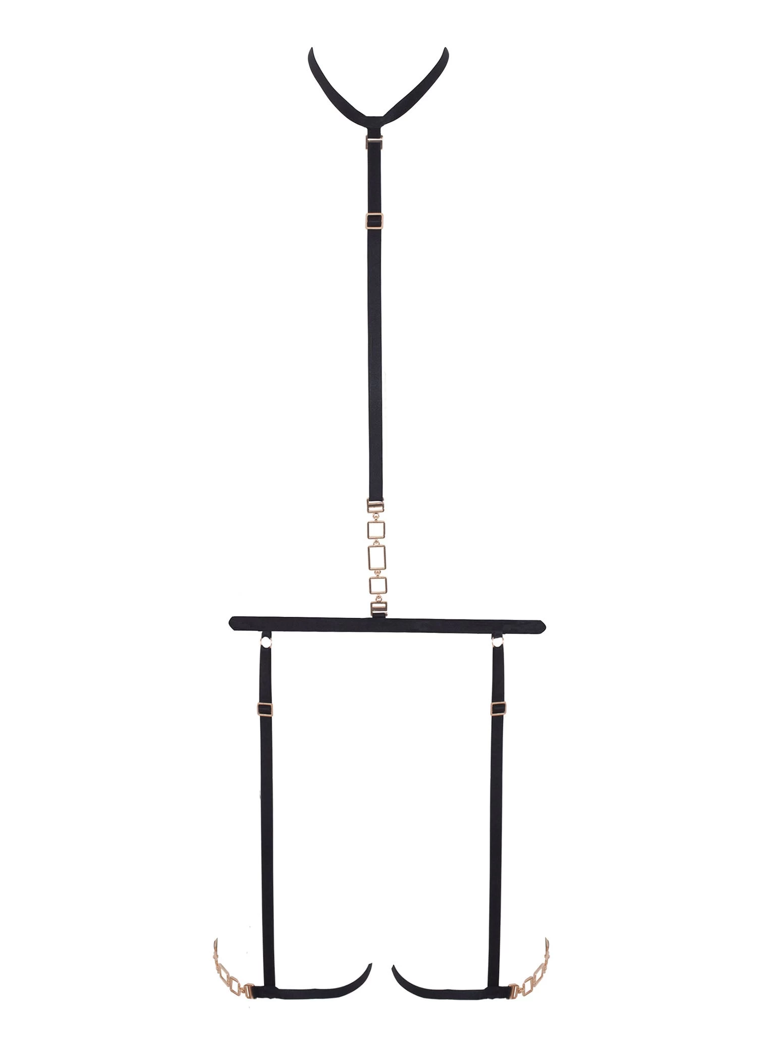 The Calypso suspender harness is more than a piece of lingerie. This decadent creation acts as a beautiful frame for your body, bringing accents of glamour and seduction to your lingerie pairings. Make sure the luxurious hardware feels at home by styling this exceptional design with the rest of the Calypso collection. An unforgettable complete look is a guarantee.