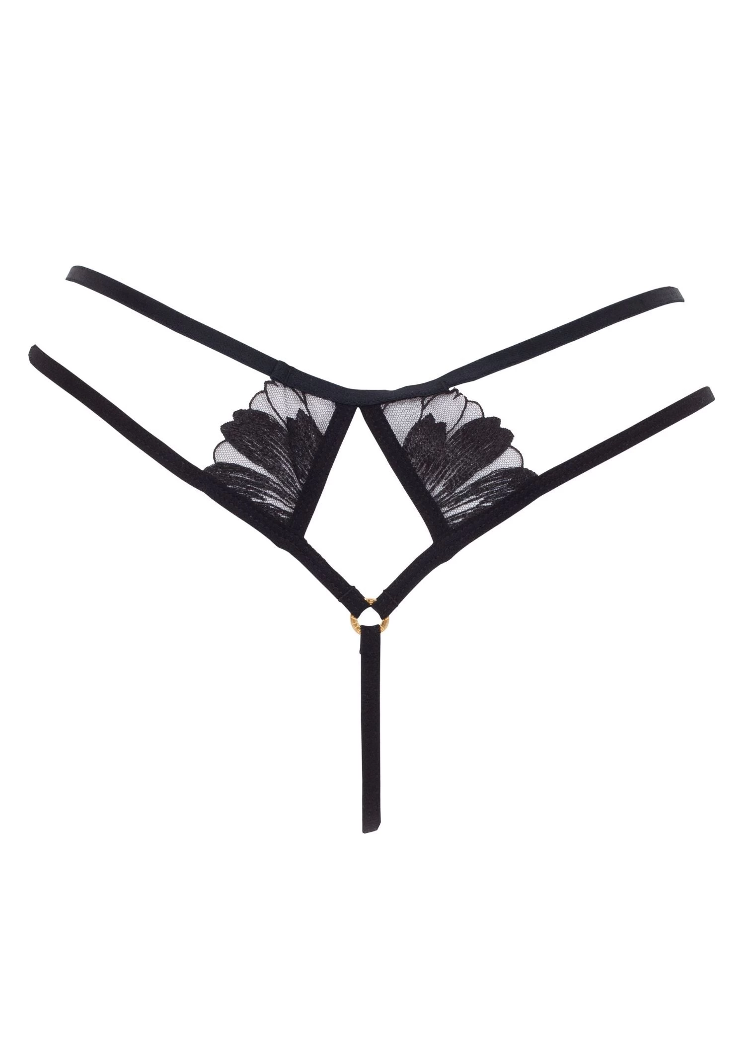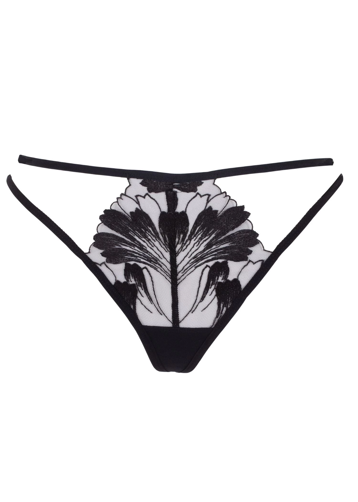 The Colette Thong creates a striking silhouette constructed of parallel slimline waistbands. Mesh panels adorned with delicate floral embroidery and tied together with a dainty gold-tone o-ring at the back.