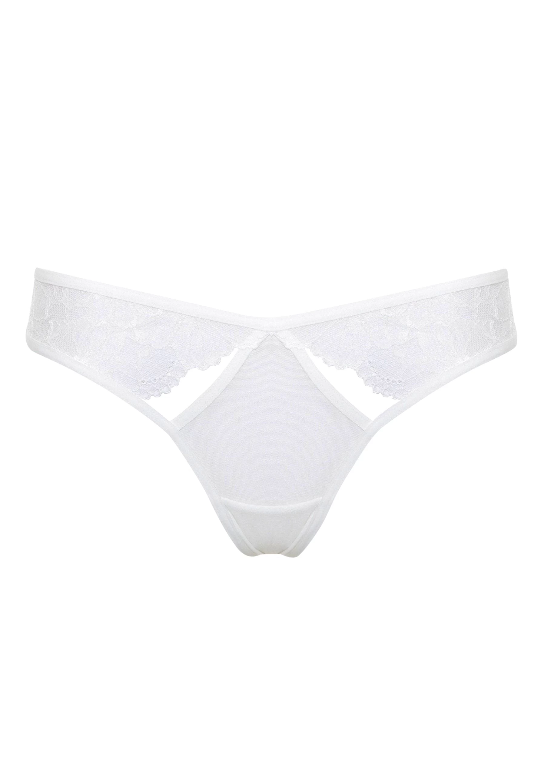 The Emerson Lace and Mesh Thong in Ivory is an understated piece. With sheer lace panels running through the front to the back, the subtle elegance is further accentuated when matched with the luxurious Open Cup Lace Bra.