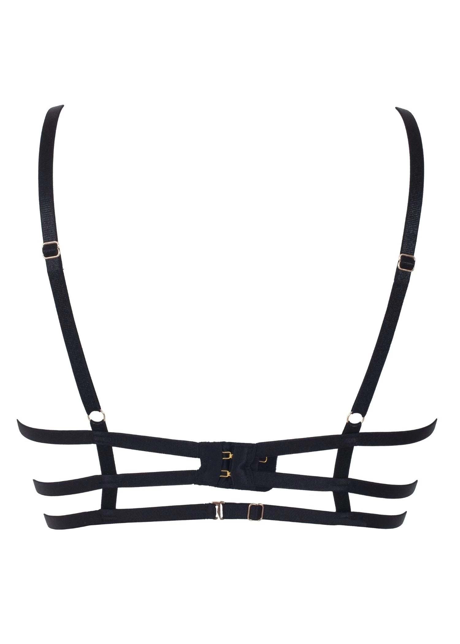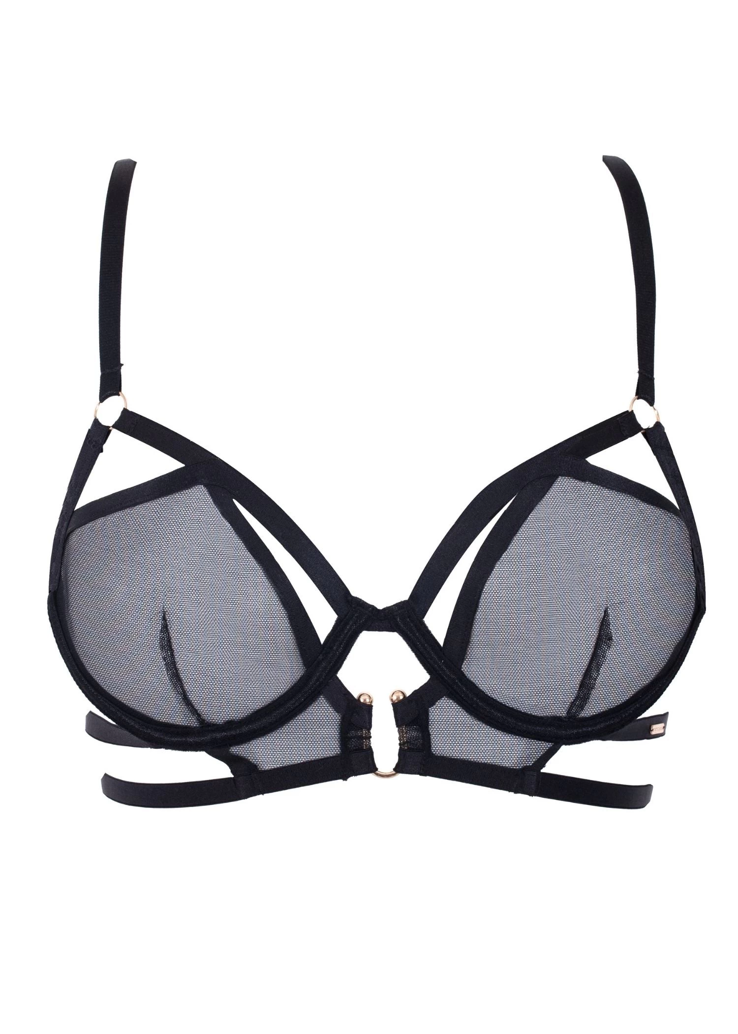 A bra for all occasions, this underwired bra offers support and style with its U-shaped golden hardware center piece. Delicate mesh cups are adorned with directional straps providing a pop of contrast.. Match with the Estelle Thong and Harness Suspender for a complete look.