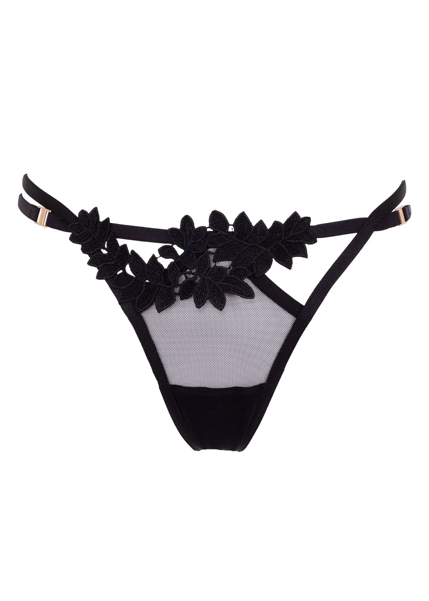 The Harley Thong is a striking piece that features gorgeous leaf embroidery on a sheer mesh panel with provocative cut-outs. Coupled with double slimline waistbands and gold-tone hardware. Wear with the Harley Bra for the complete outfit.