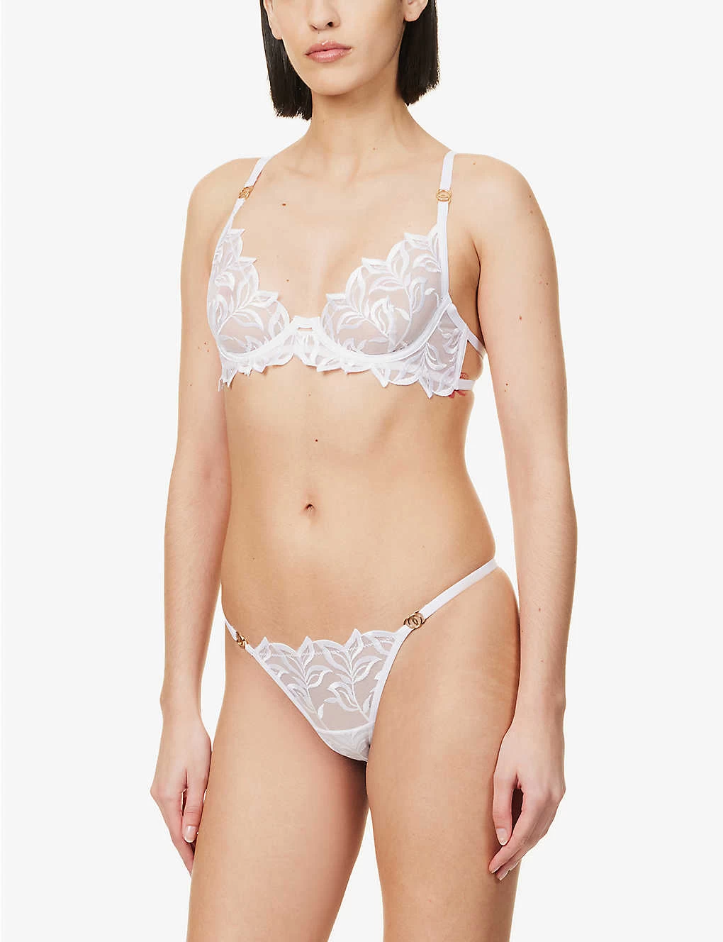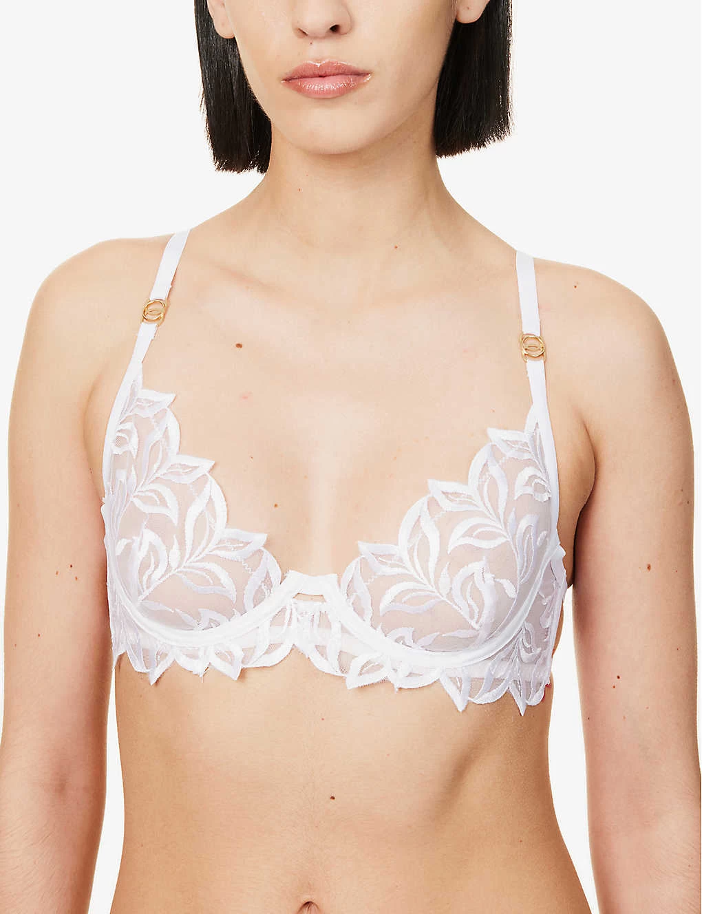 - Plunge silhouette, soft moulded cups with underwiring, all-over embroidered floral pattern, branded gold-toned hardware, scalloped trims, side-boning