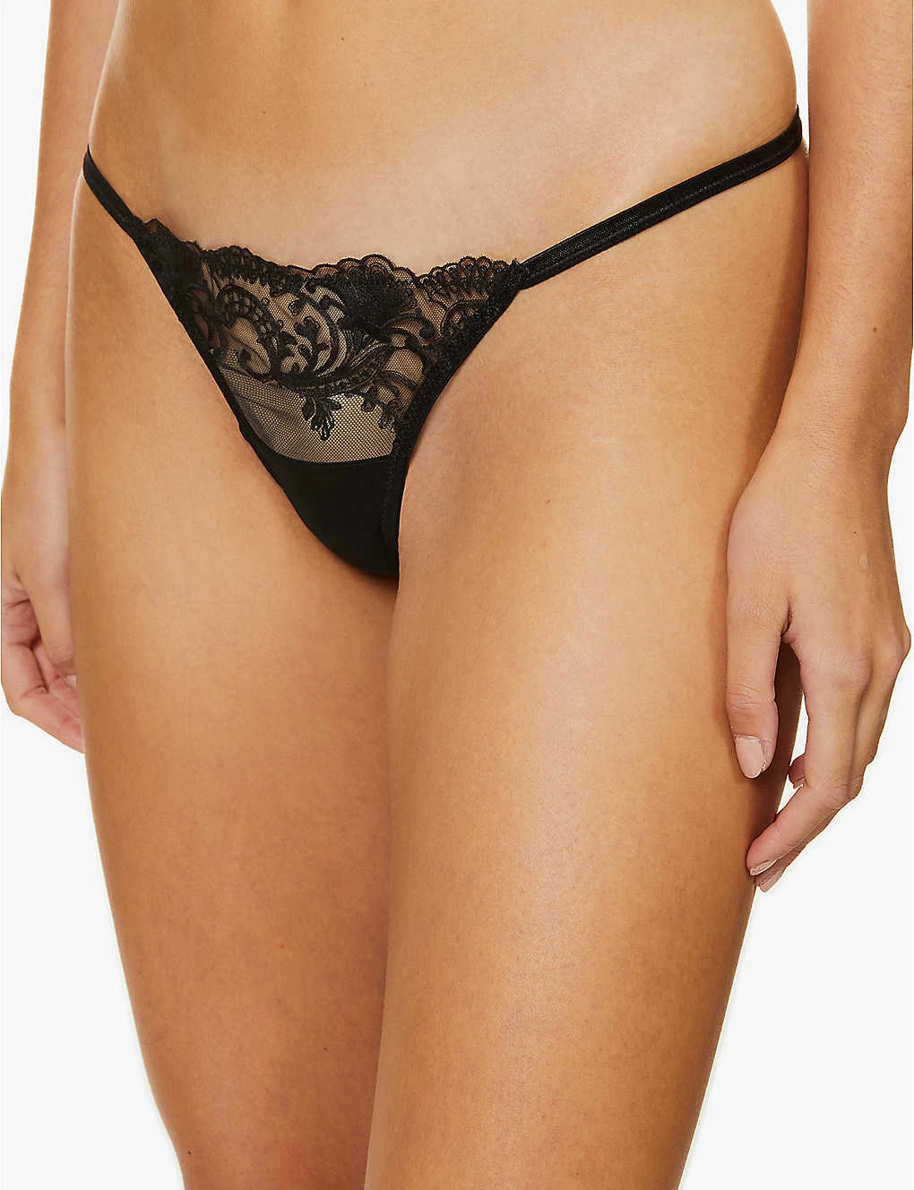 - Mid-rise, elasticated waistband, semi-sheer tulle panel at front, scalloped trim at front, metallic brand plaque at back, G-string at back, lined gusset