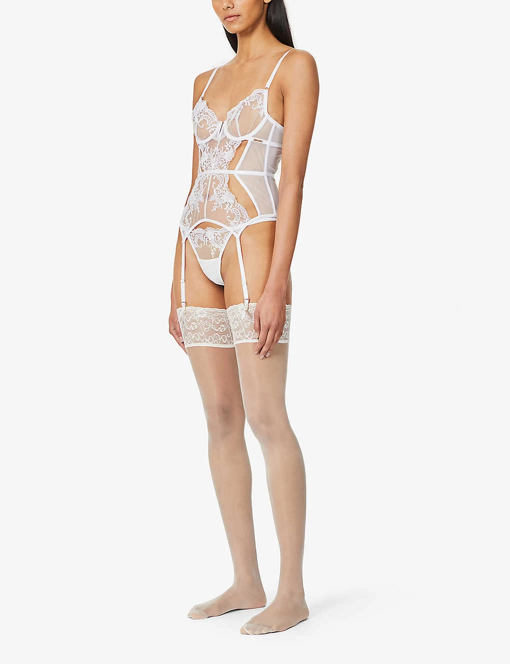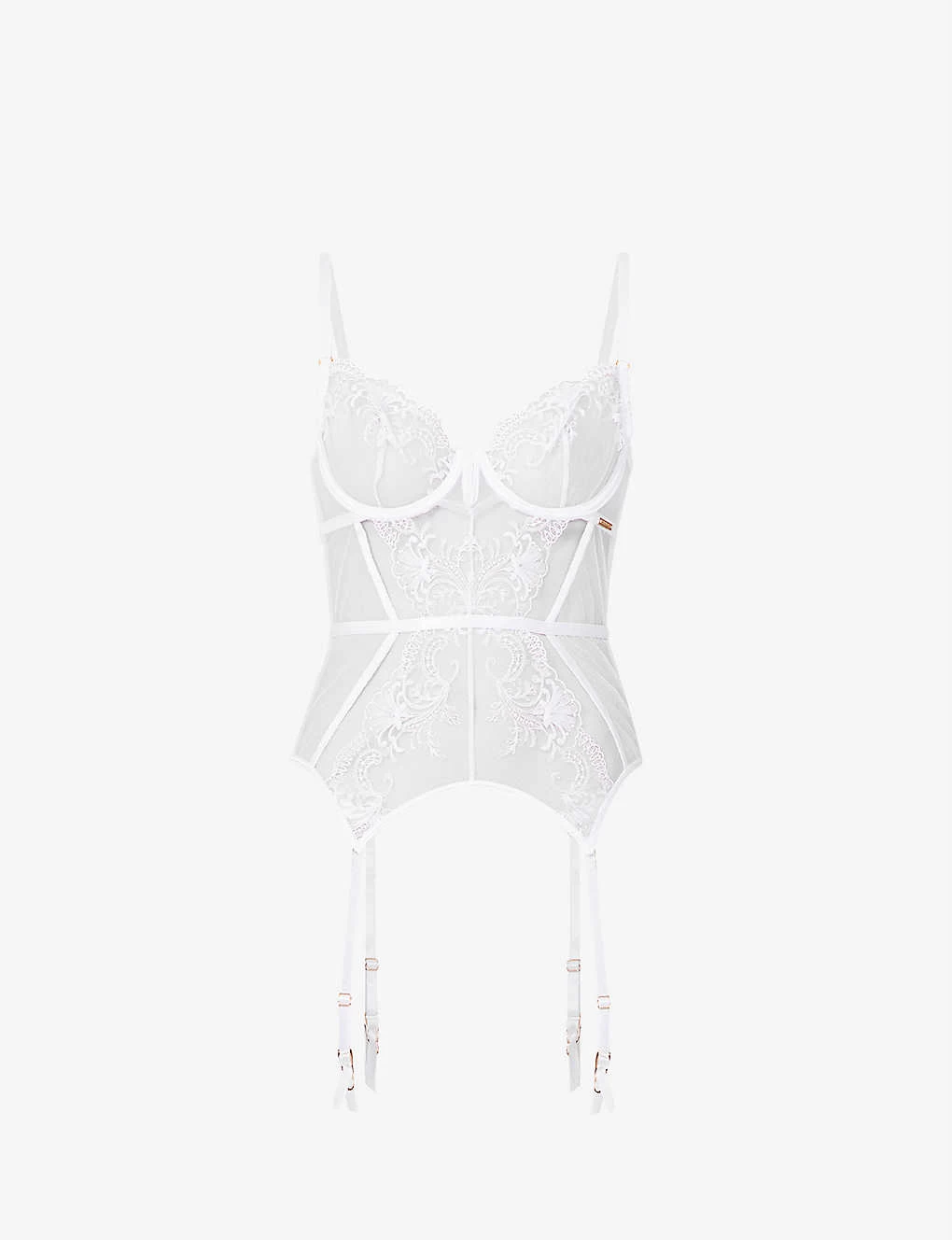 - Adjustable shoulder straps, underwired, all-over embroidered, interior boning at sides, four adjustable suspender clips
