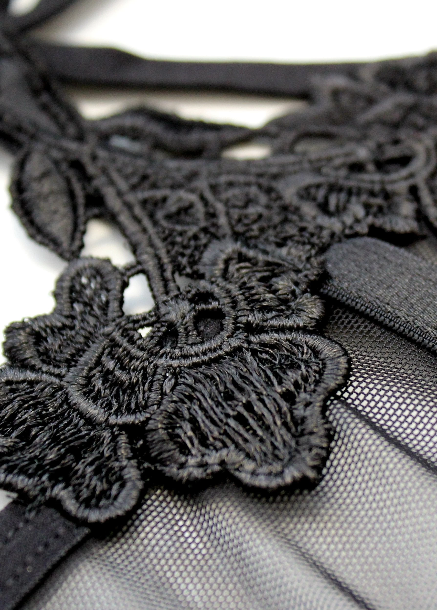 Like a birdcage decorated with wildflowers, this contemporary basque makes use of delicate lace, botanical embellishments and directional strapping to produce one heck of a provocative statement.