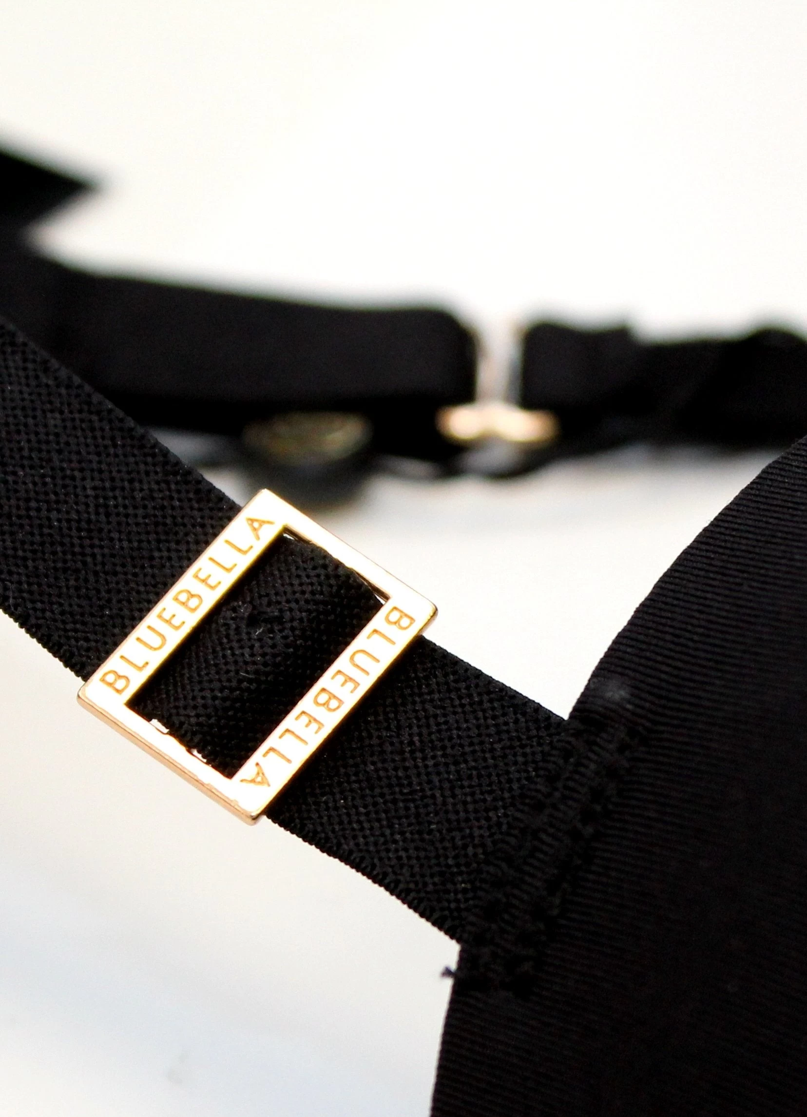 The visually dramatic use of bold strapping ain’t just looks. The molded cups and line of soft boning at the side supports the web of elasticated straps, coupled with the neoteric halter-neck strap fastened by a swan-neck clasp.