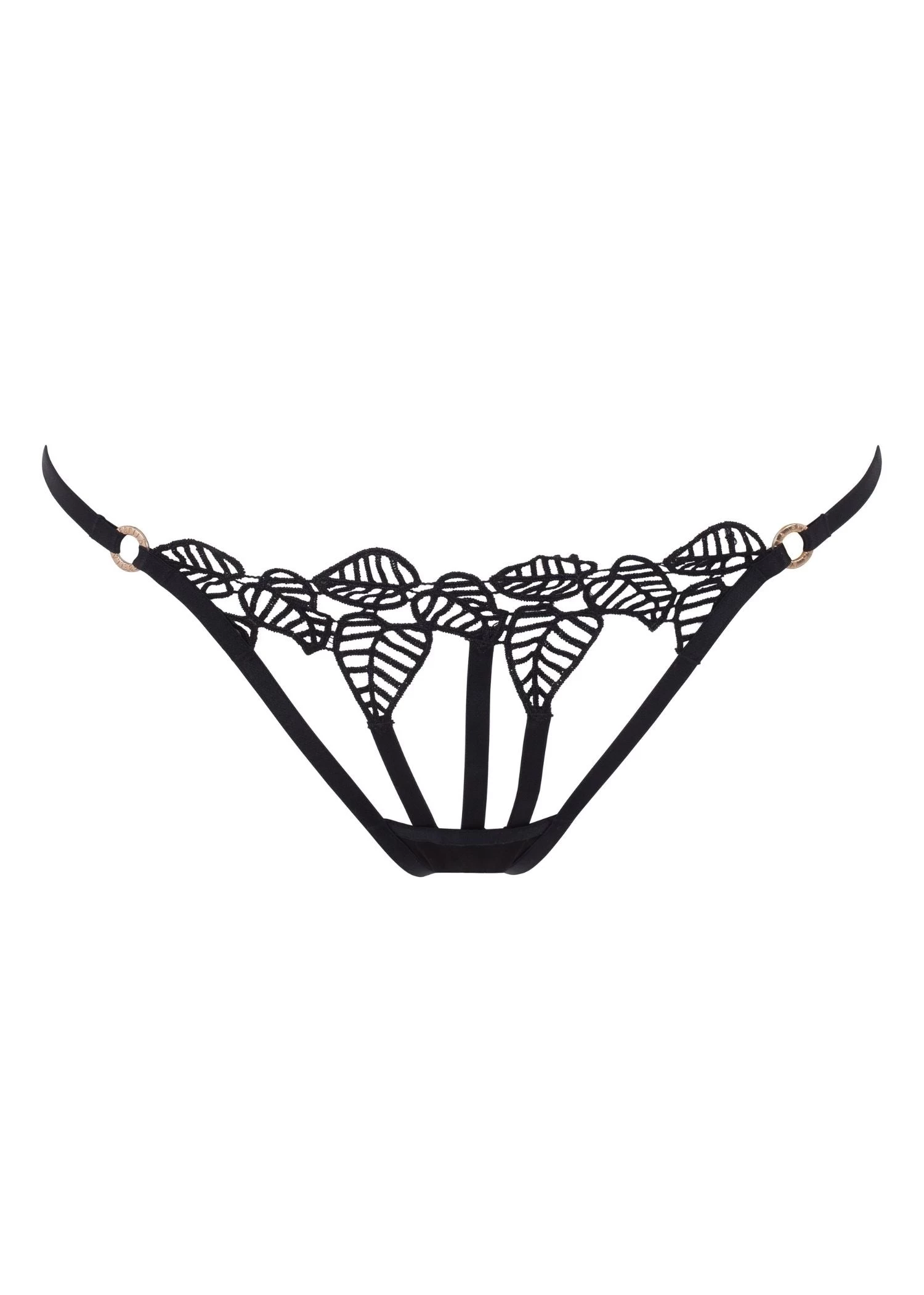 This exquisite thong is the perfect piece for a lasting impression. Featuring delicate leaf-inspired embroidery over a cut-out front panel, added with gold-tone hardware for an enticing touch. Pair this with matching Sapphira Open Bra to complete the style.