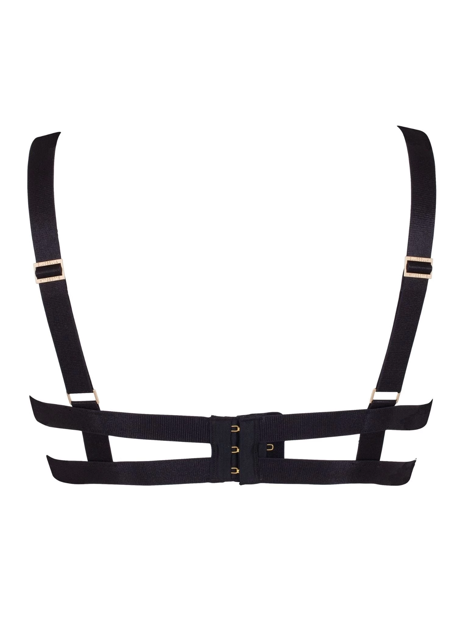 Minimal design with some serious impact. The Slade Bra features bold cage-effect open cups using wide banding, with faux leather and gold-tone buckle details. Wear with the Slade Thong for a striking look.