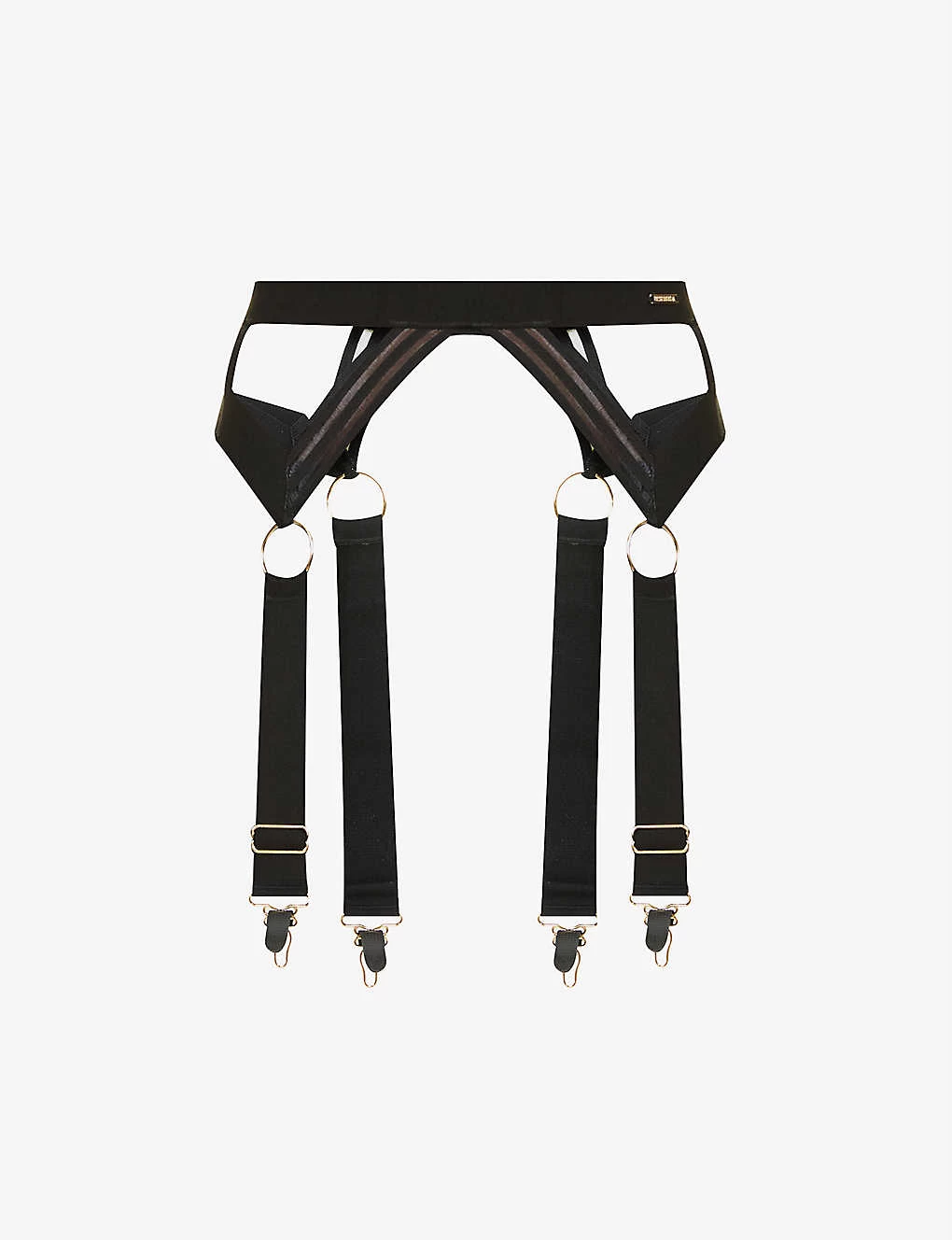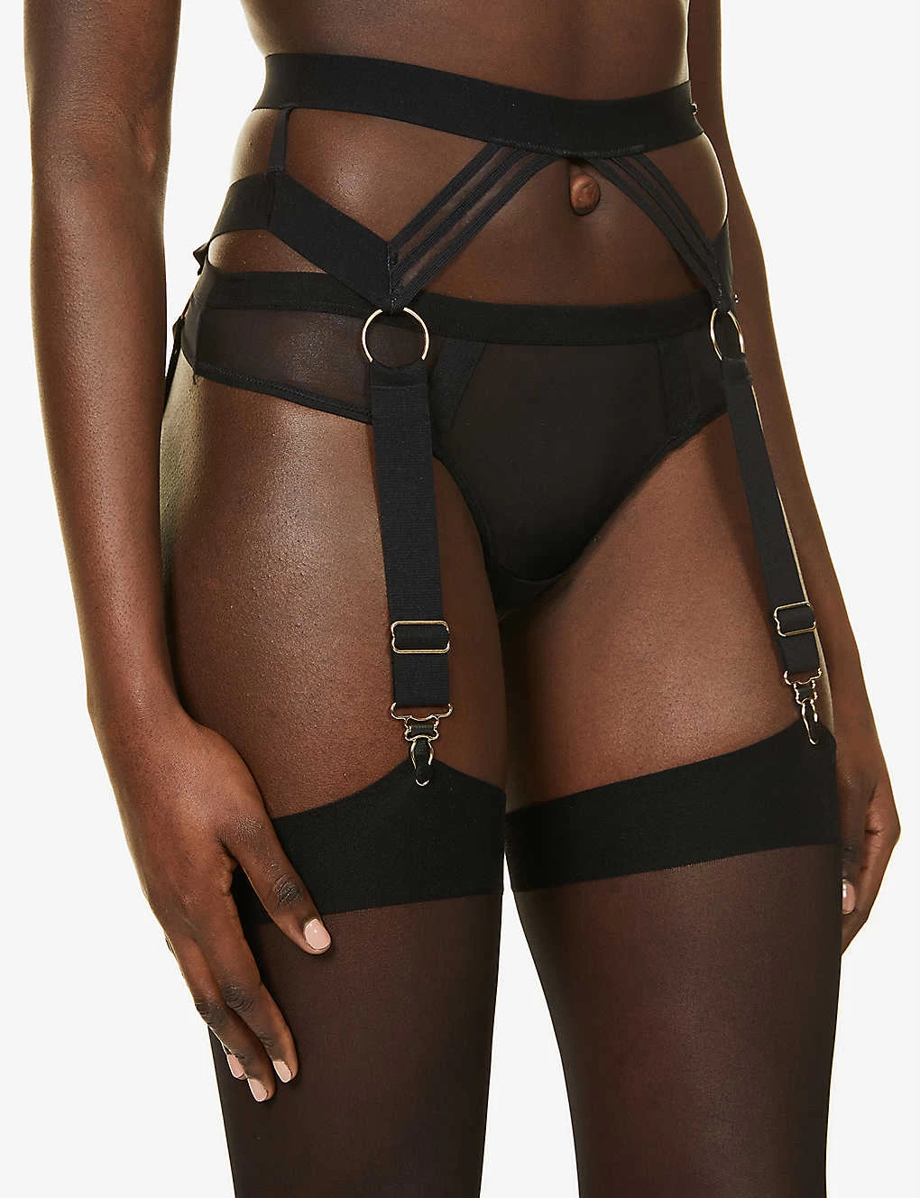 - Low-rise, elasticated waistband, metallic brand plaque at waistband, gold-toned hardware, adjustable straps, suspender clips