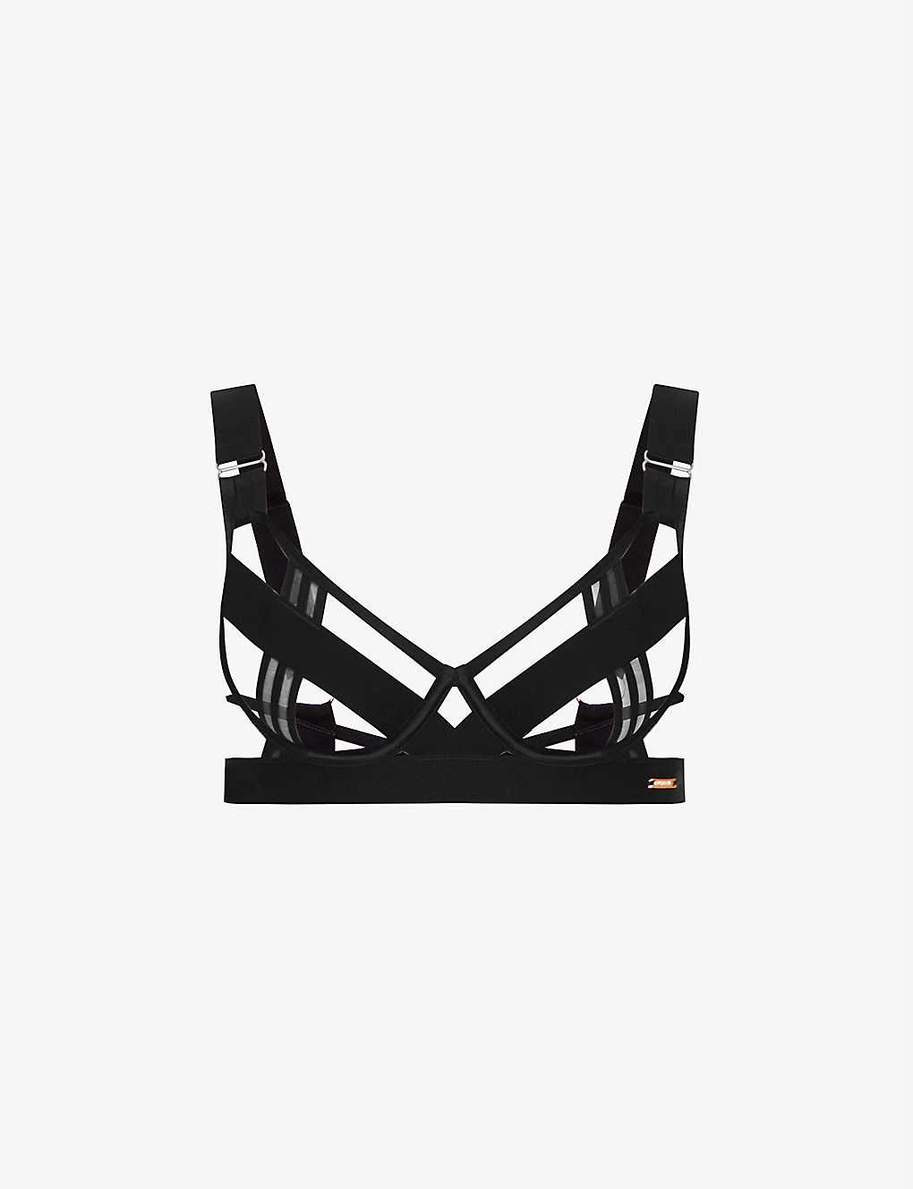 - V-neck, adjustable shoulder straps, gold-toned hardware, open cups, elasticated under band, metallic brand plaque at front