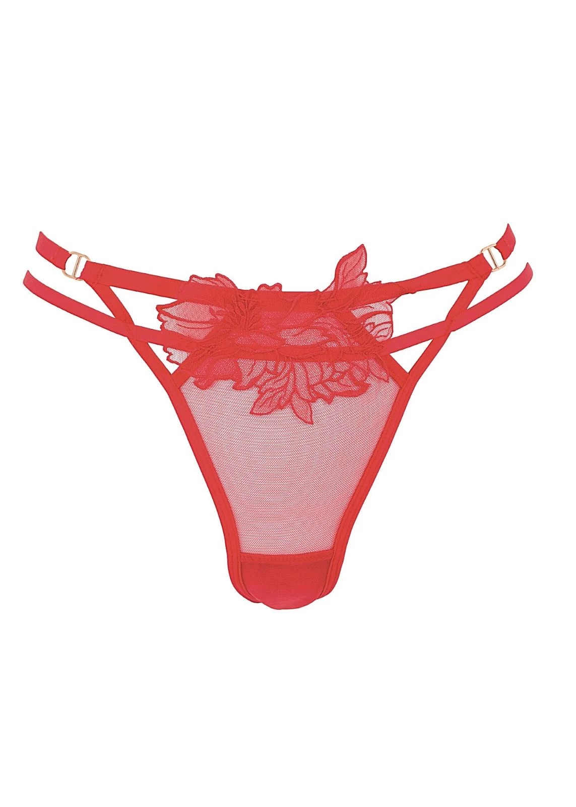 The embroidered mesh appliqué centerpiece lies upon two slimline elastic waistbands to create a flattering shape. Wear it with the Tempest Bra for a bold red look.
